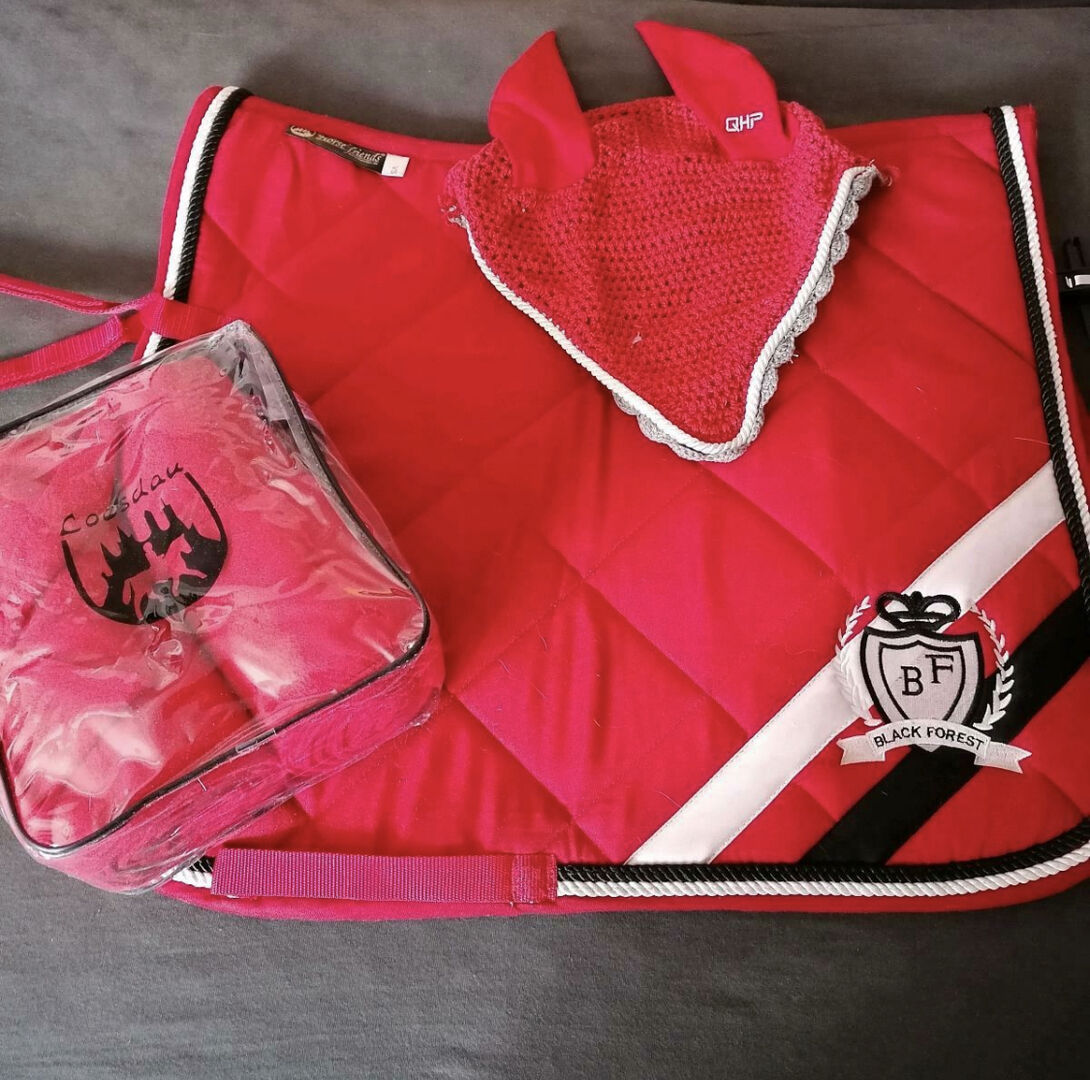 Schwarzwald Schabracke - Säljer välbevarad Black Forest-sadelunderlag i rött med matchande bandage och flughätta.