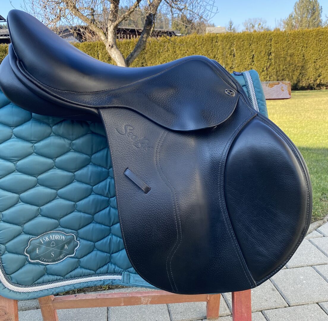 Seabis Kentucky Pro M 17 tums hoppsadel svart - Svart hoppsadel Seabis Kentucky Pro M med blå kotlettplatta (Medium) - på begäran även med röd kotlettplatta (Narrow) inklusive Seabis sadelskydd. Köptes ny direkt från Seabis för €2.200,00 i februari 2023. De ursprungliga knärullarna har ersatts av större knärullar med kardborreband. De ursprungliga knärullarna finns fortfarande kvar. Sadeln användes som en andra sadel och förvarades alltid med sadelöverdrag i en uppvärmd sadelkammare. Det smärtar mig att behöva sälja denna fantastiska sadel, men min häst har förändrats så mycket fysiskt att den helt enkelt inte längre passar. Sadeln kommer inte att skickas på prov på grund av dess mycket goda skick.