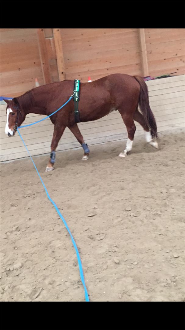 Selen för att ta sig upp i luften - Kvalitets neoprenlongeringsgjord för warmblood fullblod med 13 ringar, kan spännas på båda sidor och kan spännas från 150cm-210. Fodrade kuddar på magremmen, färg grön, 2X begagnad - nästan ny.