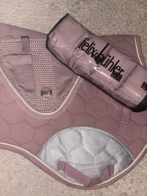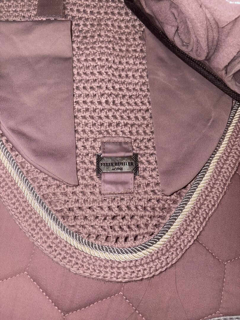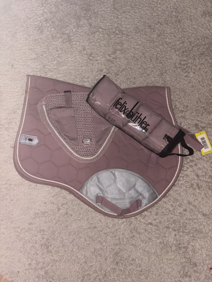 Jag säljer ett vackert set i dusky pink, bestående av: - Schabrake (fälttävlan) - Showmaster - Flugöron (full storlek) - Felix Bühler - Bandage - Felix Bühler