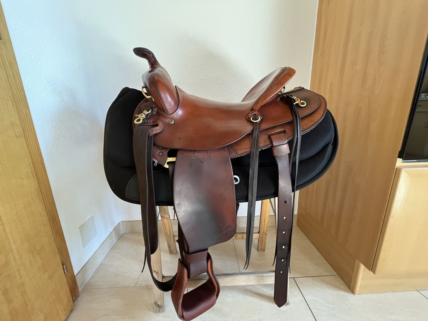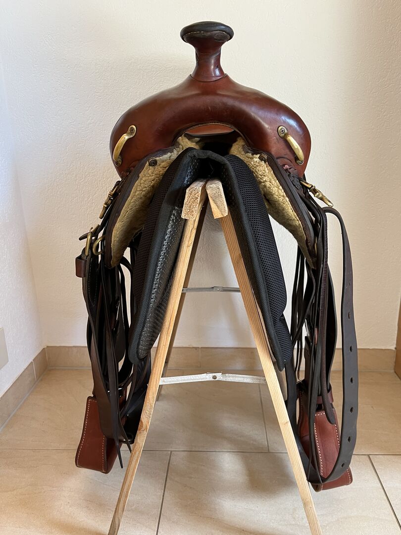 Vacker, mycket välskött SS 15 CC-4 westernsadel inkl. avtagbara baksadelgjordar, latigo, off billet och nya stigbyglar till salu. Längd 56 cm. Ligger på VA med bred axel.