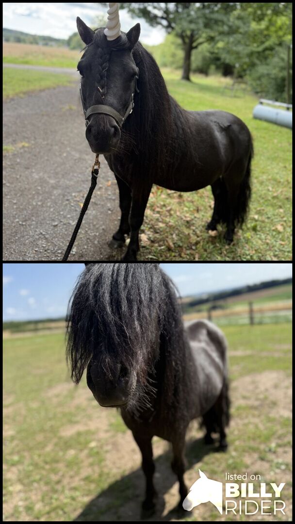 Shetlandsponny // Barnhäst // Körponny - Till salu är en charmig shetlandsponnyhingst, född 2021. Med en höjd av 98 cm är han den perfekta följeslagaren för små ryttare eller som en kärleksfull fritidspartner. **Karaktäristika:** - Ras: Shetlandsponny - Kön: Hingst - Födelseår: 2021 - Färg: svart - Höjd vid skänkeln: 98 cm Vår lilla hingst imponerar inte bara med sin vänliga natur, utan också med sin vilja att lära sig. Han är redan van vid att ridas och visar stor potential för vidareutbildning. Han är väl socialiserad, lever i en harmonisk flock och är vid perfekt hälsa. Vi letar efter ett kärleksfullt hem för honom där han kommer att fortsätta att utmanas och uppmuntras. Om det finns några problem med transport kan han också adopteras om det behövs. Videor kan också skickas. Om du är intresserad eller har några ytterligare frågor ser vi fram emot ditt meddelande!