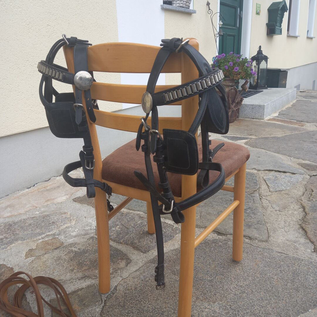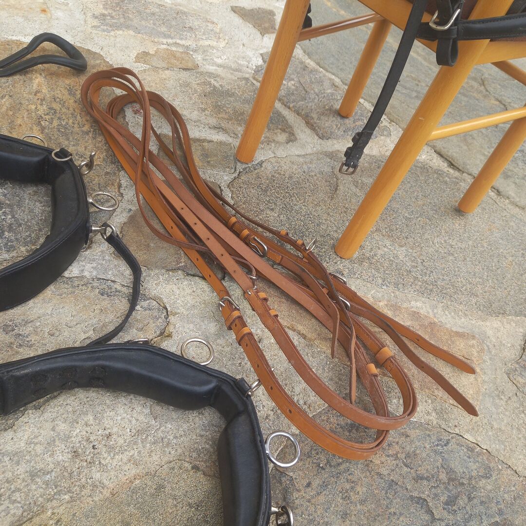 Shetty 2-hästars bröstplåtsharnesk - Till salu en lite begagnad Shetty 2 häst bröstplatta sele. Selen är komplett med ledningar. Bröstplatta 100cm lång, 6,5cm bred För magomkrets från 106cm till 136cm