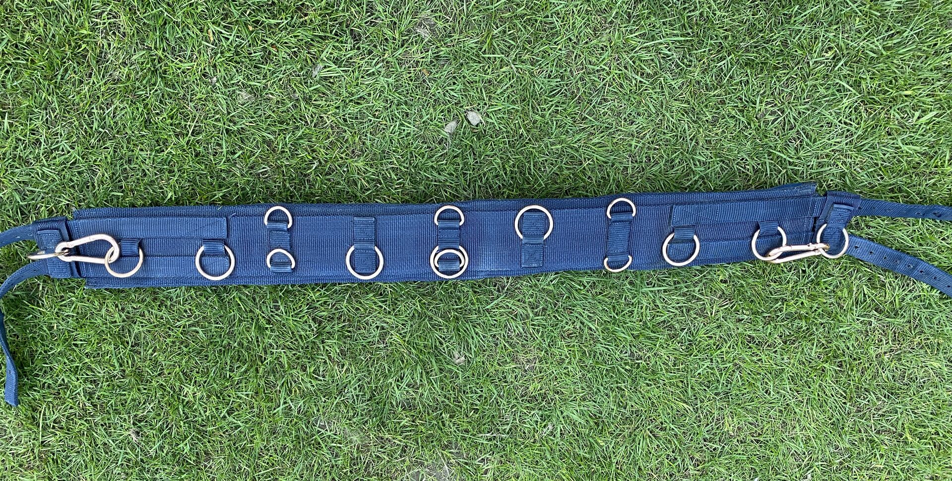 Showmaster longeringsgjord blå/roséguld hel - Lite begagnad longeringsgjord från Showmaster i storlek Full. Beslagen är i roséguld med lite rostfläckar, vilket syns på bilderna.