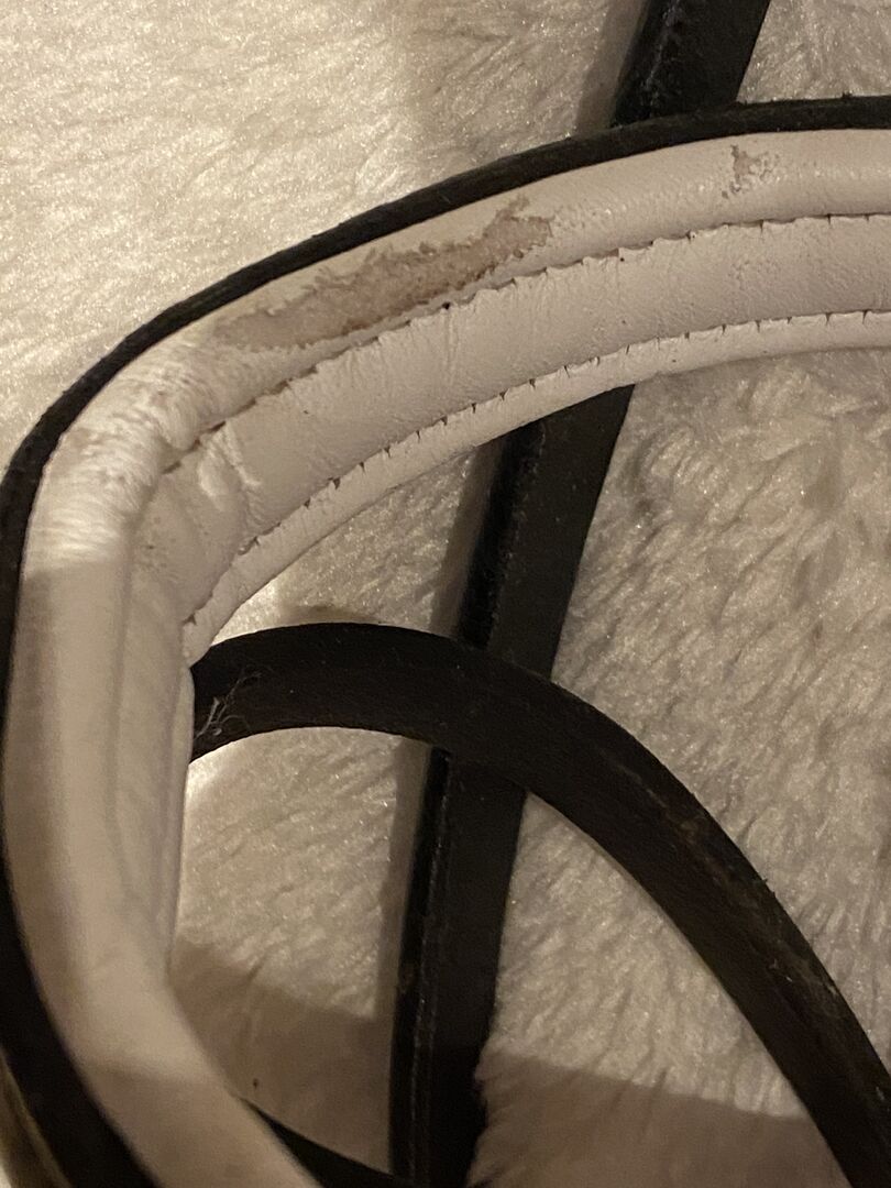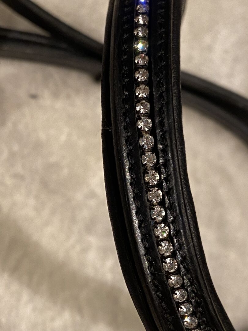 Showmaster Pony Snaffle - Jag erbjuder en Showmaster träns med original pannband och en köpt strinstrap från Claridge House. Näsbandet är lite trasigt på ett ställe. I övrigt är den i gott skick, tyglar kan köpas vid behov.