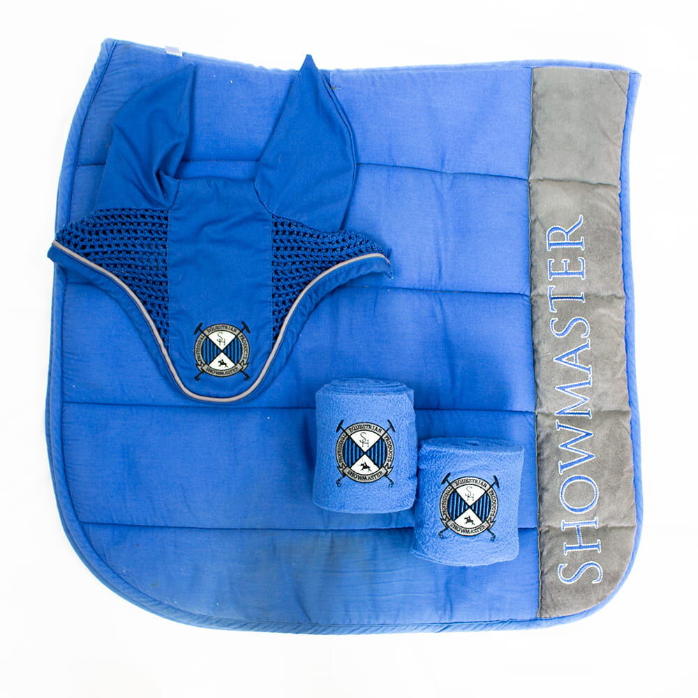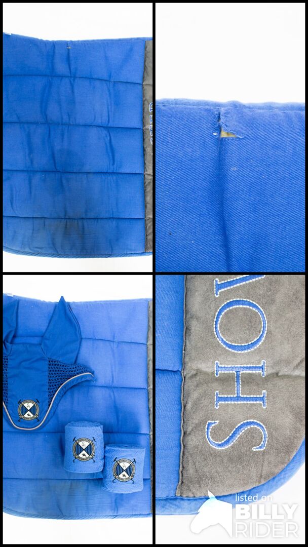 Showmaster Saddle Pad blå DR - Ett vackert dressyrsadelunderlag från företaget Showmaster. Den vackra träningsunderlägget har en blå färg. Den har mycket stor quiltning och en stor grå rand med Showmaster-skrift på kanten. Sadelunderlaget är generellt sett i gott skick. Tyvärr har den en liten reva under sadeln som lätt kan repareras. Vi har också matchande bandage och en flughätta i butiken.