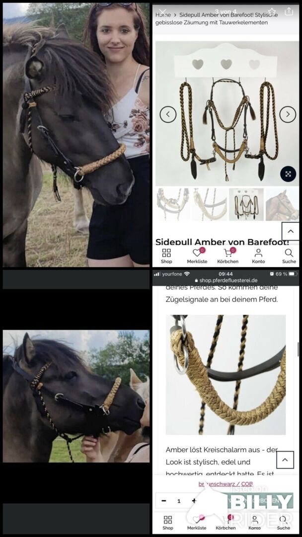 Sidepull med tyglar från Barefoot - Sidopullen kostade 100 euro ny, tyglarna 70 euro nya. Jag använde tygel och tyglar två gånger för fotografering. Nu står den i min garderob. Jag vill ha 145 euro med frakt. Den är som ny. Storleken är : Cop och den har ingen mengel.