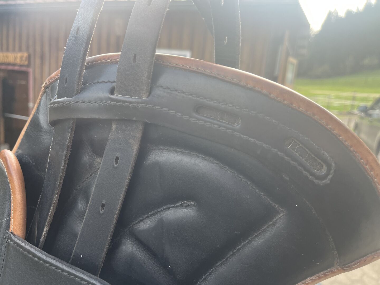 Den har följande defekter: små och ytliga repor (på grund av ålder/användning), ett sadelgjordsband har kortats för hand, den bruna kanten är blekt på vissa ställen. Defekterna påverkar inte alls sadelns funktion. Sadeln har inte någon justerbar kotlettplatta.