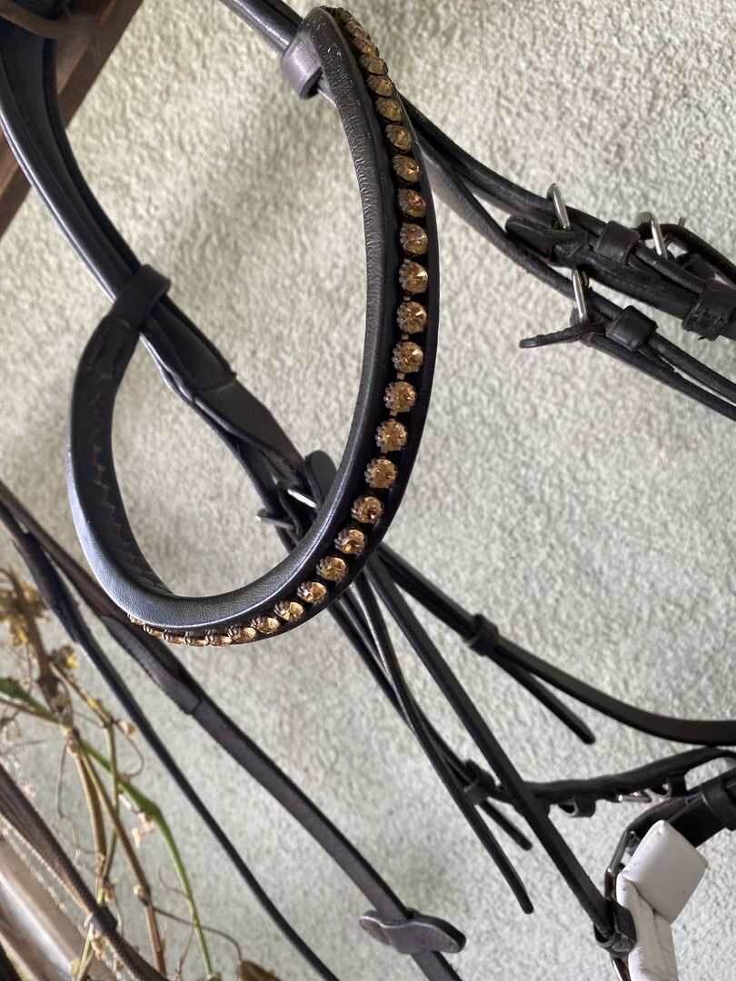 Snaffle brun vit fodrad med lack - Vitryggig brun patentträns med svenskt spänne. Träsket är i gott skick. Endast små tecken på användning. Ytterligare hål har gjorts i trottoarremmen. Begagnade tyglar (se bilder) från ett annat märke kan också köpas. Surran kommer att rengöras och smörjas innan den skickas.