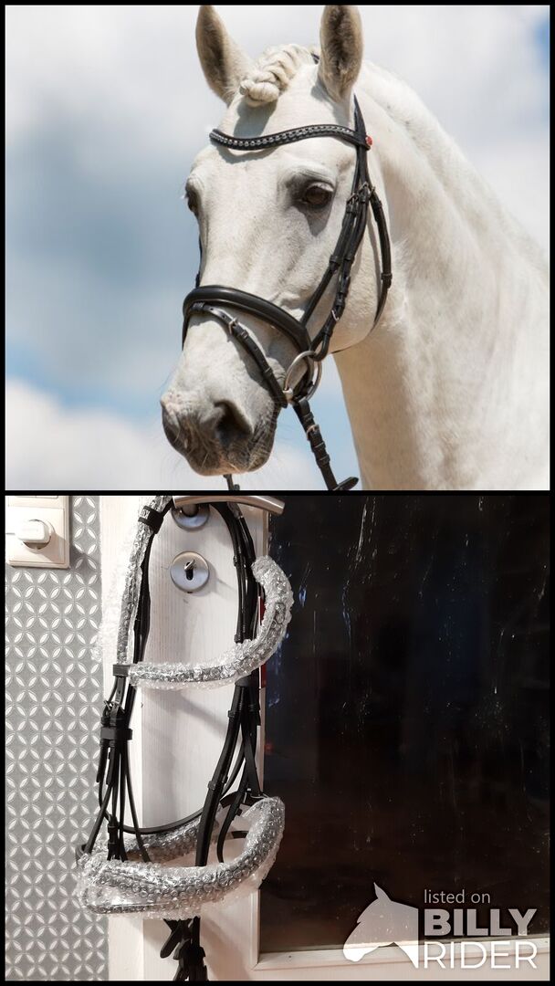 Egenskaper: Tillverkat av särskilt mjukt läder Bekväm öronutskärning Böjt pannband (ej fodrat) med grå kristaller Näsbygelns bredd: 32 mm Integrerat engelskt kombinerat näsband att spänna fast på båda sidor Svart/svart foder Spännen i krom Inklusive tyglar i webbform