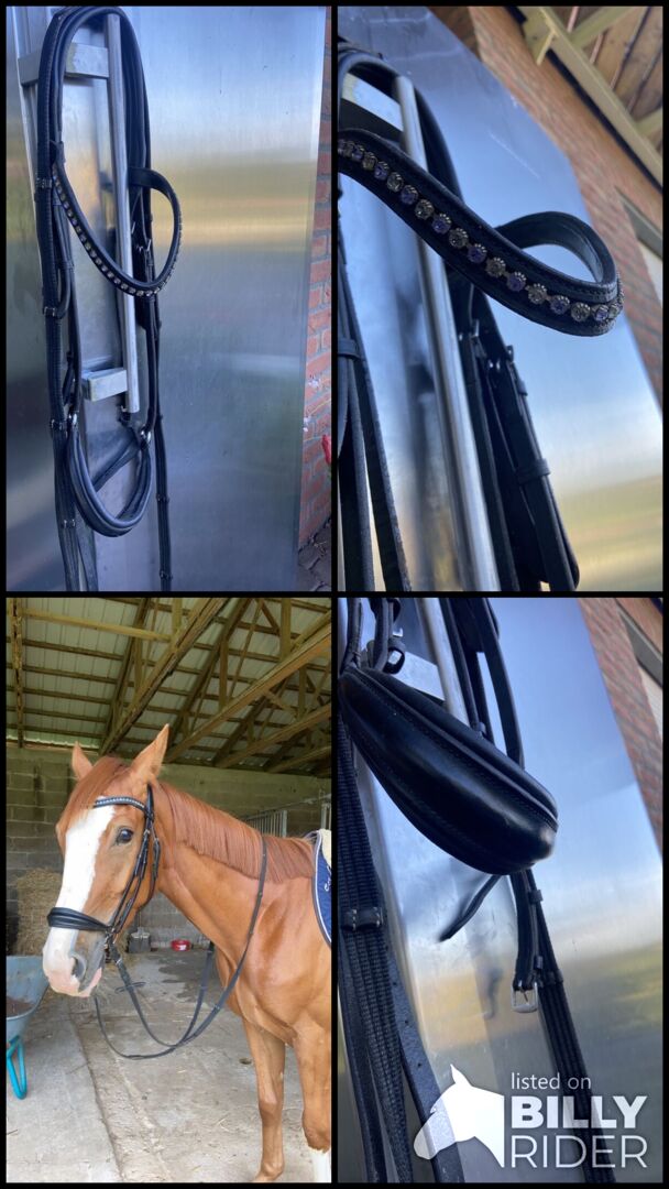 Snaffle fullblod - Jag säljer min fullblodsträns. Den har varit på hästen tre gånger och har tvättats med lädertvål varje gång efter användning och sedan smörjts in. Jag skulle inkludera tyglarna. Det ursprungliga inköpspriset var 80 euro.