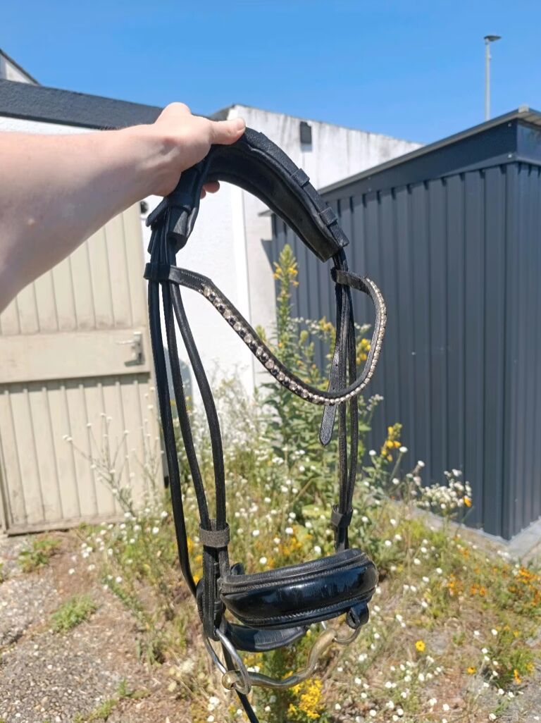 Snaffle rund sydd patent svart WB - Till salu detta runda sydda träns från Nike Horseproducts i storlek WB, nosgrimman är tillverkad i lack med svart läderunderlägg, utan tyglar och utan bett