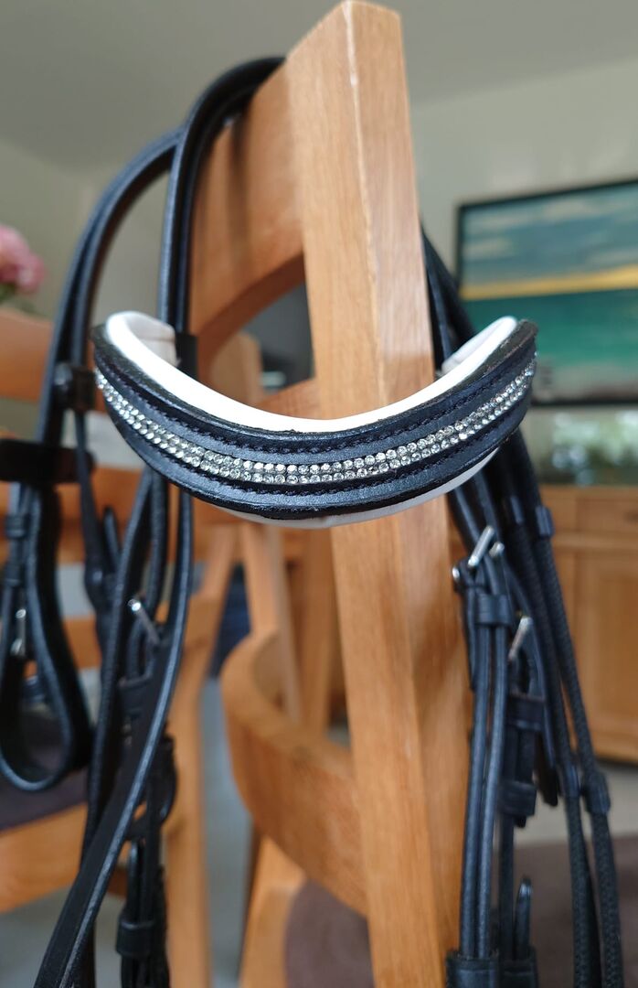 Med glittrande pannband, tyglar och dubbelt brutet skänkelträns, 11 cm.