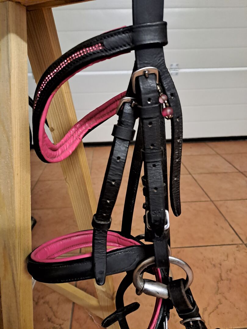 Snaffle shetty rosa fodrad med bett - Tränset säljs med bett och tyglar.