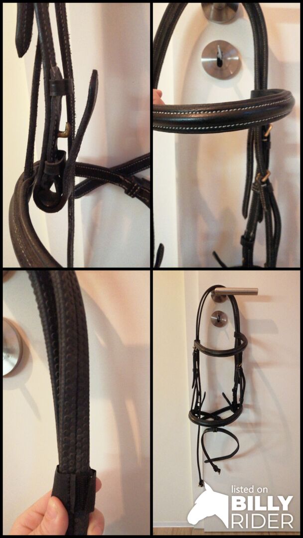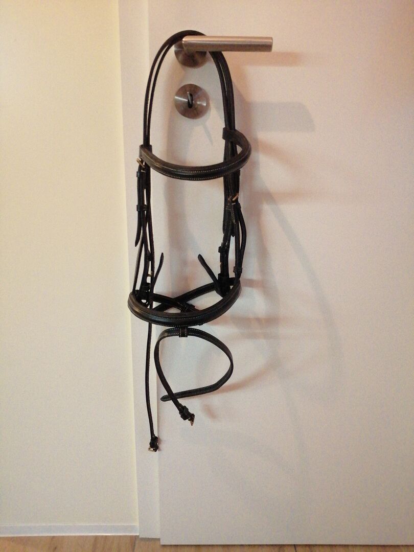 Snaffle VB-English Caveson - På grund av att mitt stallskåp har blivit mindre, erbjuder jag två begagnade vackra tävlingssnafflar. Engelskt näsband med matchande tyglar. Vit broderi, se bild.
