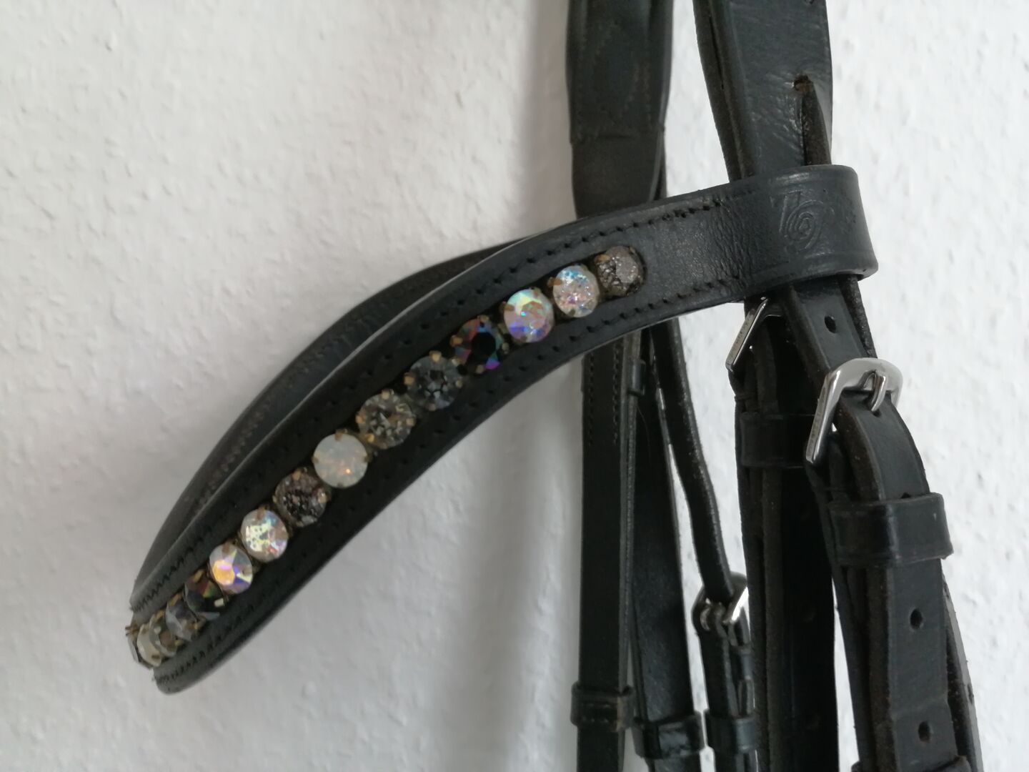 Snaffle Warmblood - Vacker svart träns av mjukt läder med böjt glittrande pannband i storlek warmblood.