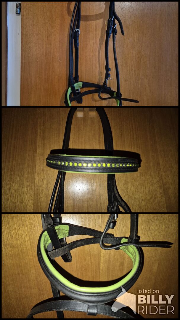 Snaffle Warmblood - Till salu en vacker snaffle i storlek varmblod. Den är grönfodrad och har gröna stenar i pannbandet, inga av dessa saknas. Lädret har alltid varit väl omhändertaget. Utan bett och tyglar.