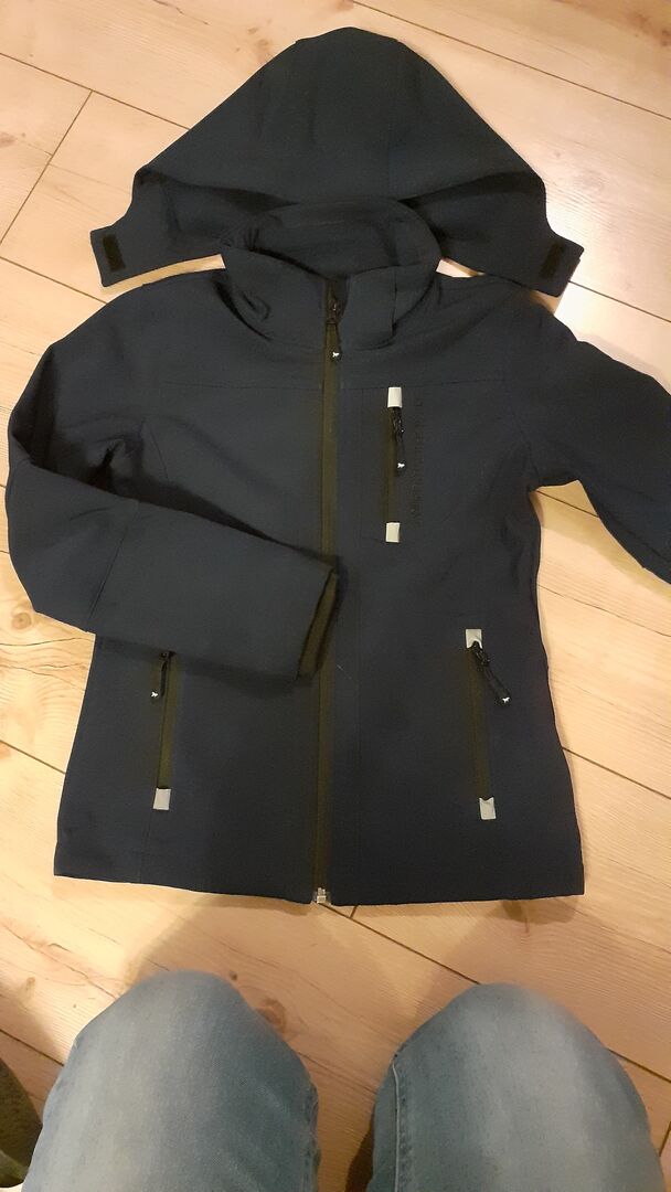 Softshelljacka, ridjacka, storlek 140 - Knappt sliten, mörkblå softshell-jacka. Perfekt när det blir kallt och fuktigt väder. Huvan kan tas av med en dragkedja. Inga hål, inga fläckar.