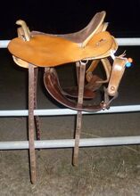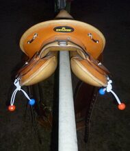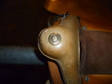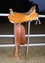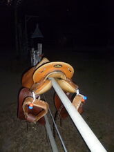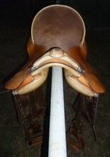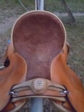 Sommer Evolution Western Trail Ridsadel 17.5 KW 34 bred cognac - Theo Sommer. Den mest använda trail sadeln i western stil bland trail ryttare, modell Evolution Western, cognac mörkbrun, super bekväm trail sadel storlek 17,5, korta punkter för mer axel frihet, justerbar kammare bredd för närvarande KW 34 bred, mjukt vadderad, bred ryggkanal, lite använd som en andra sadel.