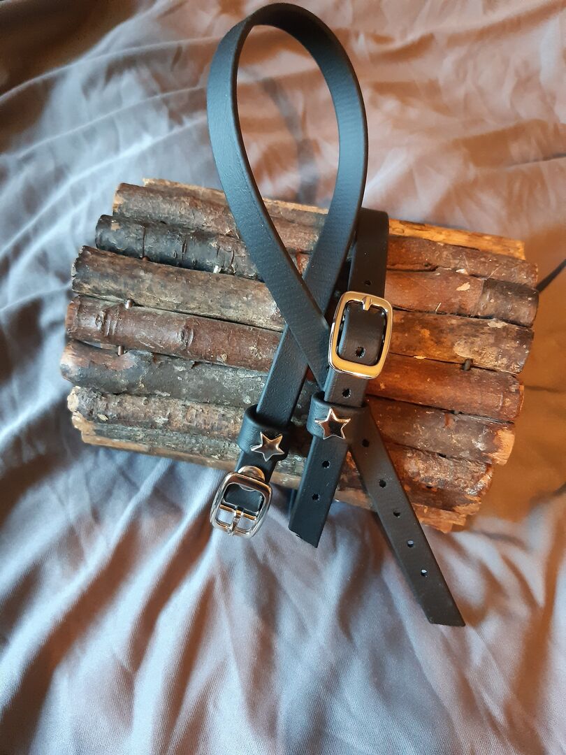 Spårremmar av biothan - Vackra sporrfälgar tillverkade av Biothane. Vardera 45 cm långa. I färgerna svart, ljusbrun (passar till cognacsfärgade stövlar) och sadelbrun. Som visas på bilderna antingen med stjärnsten, vit eller rosa sten. Superstarka remmar.
