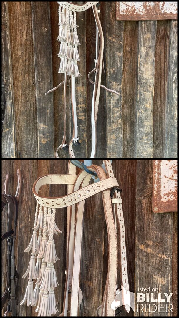 Spanskt träns med tyglar vitt - Jag säljer en spansk träns här. Jag använde den som en västerländsk träns. Det brukade finnas ett nosband (det var för grovt för mig och passade inte mitt sto ... Men jag kan leta efter det om det behövs). Skulle säga att det är storlek COB 25 € inkl. försäkrad frakt