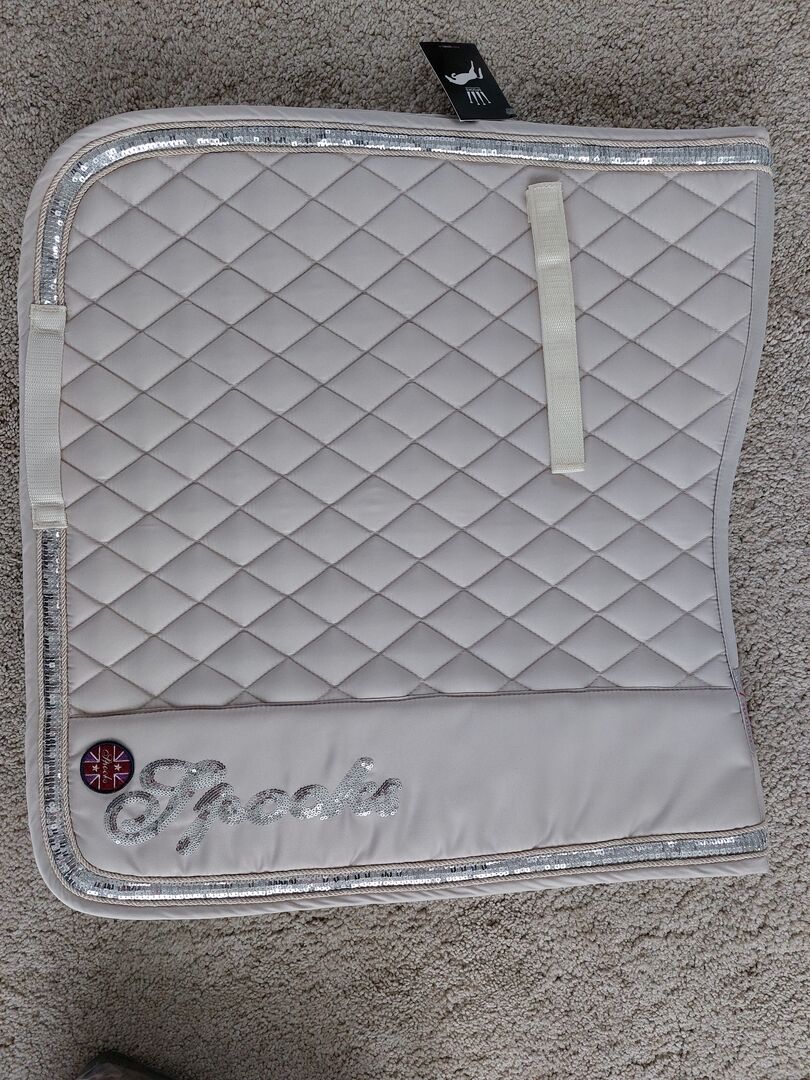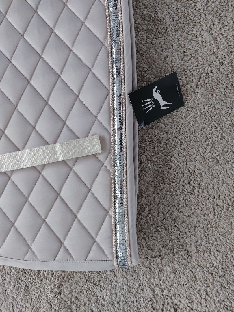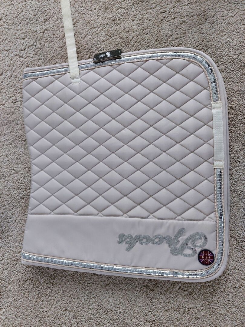 Spooks Saddle Pad Verona Ivory Dressage Sequin Cord - Helt ny Spooks dressyrsadelunderlag modell Verona i elfenben, storlek DL. Med paljettsnöre och bokstäver. Ursprungligt pris:69,90
