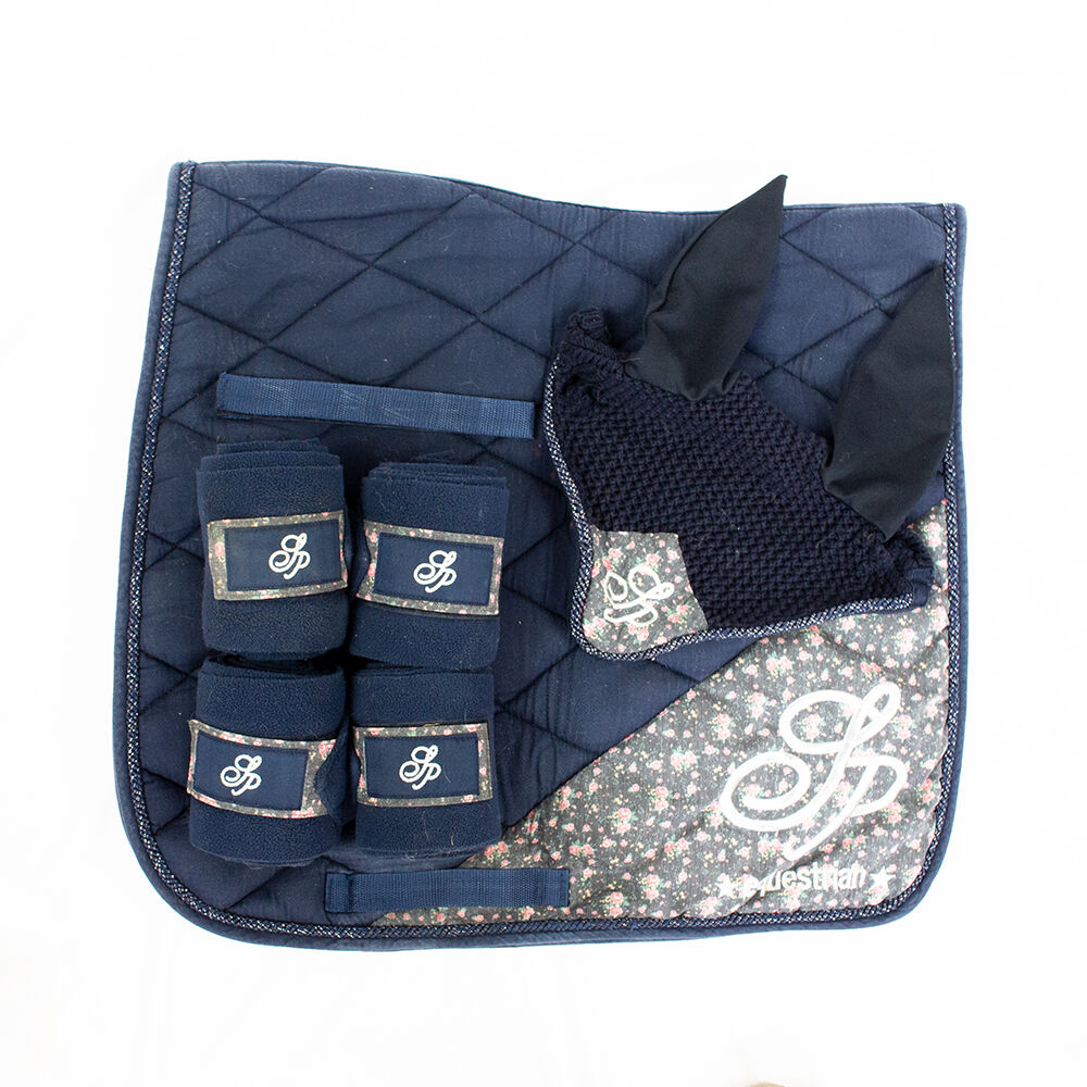 Spooks sadelunderlag "Flower" Navy DR - Ett vackert och högkvalitativt dressyrsadelunderlag från Spooks. Den fantastiska blå sadelunderlägget med blommönster är ett riktigt blickfång under sadeln. Spooks sadelduk har logotypen i vitt broderad på båda sidor av det stora rosmönstret. Den är också försedd med en snygg glittersnodd. Förutom sadelunderlaget har vi även matchande bandage och flugöron i vår butik. Sadelunderlaget har spår av användning, t.ex. enstaka fläckar. To the seller's offerlaunch