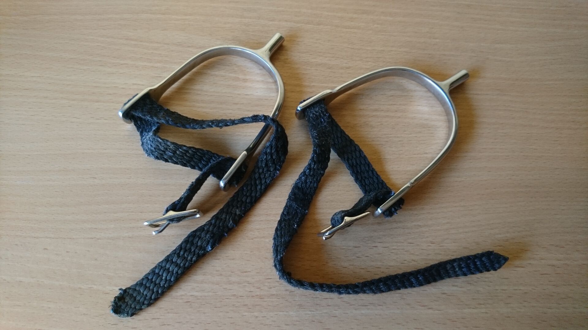 Sporrar med nylonband - Tyvärr måste vi av hälsoskäl och med tungt hjärta ge upp vår hobby. Därför erbjuder vi här ett par sporrar med nylonband. Mätningar: Spikens längd: ca 2 cm Total längd: ca 12 cm Bredd: ca 8,5 cm
