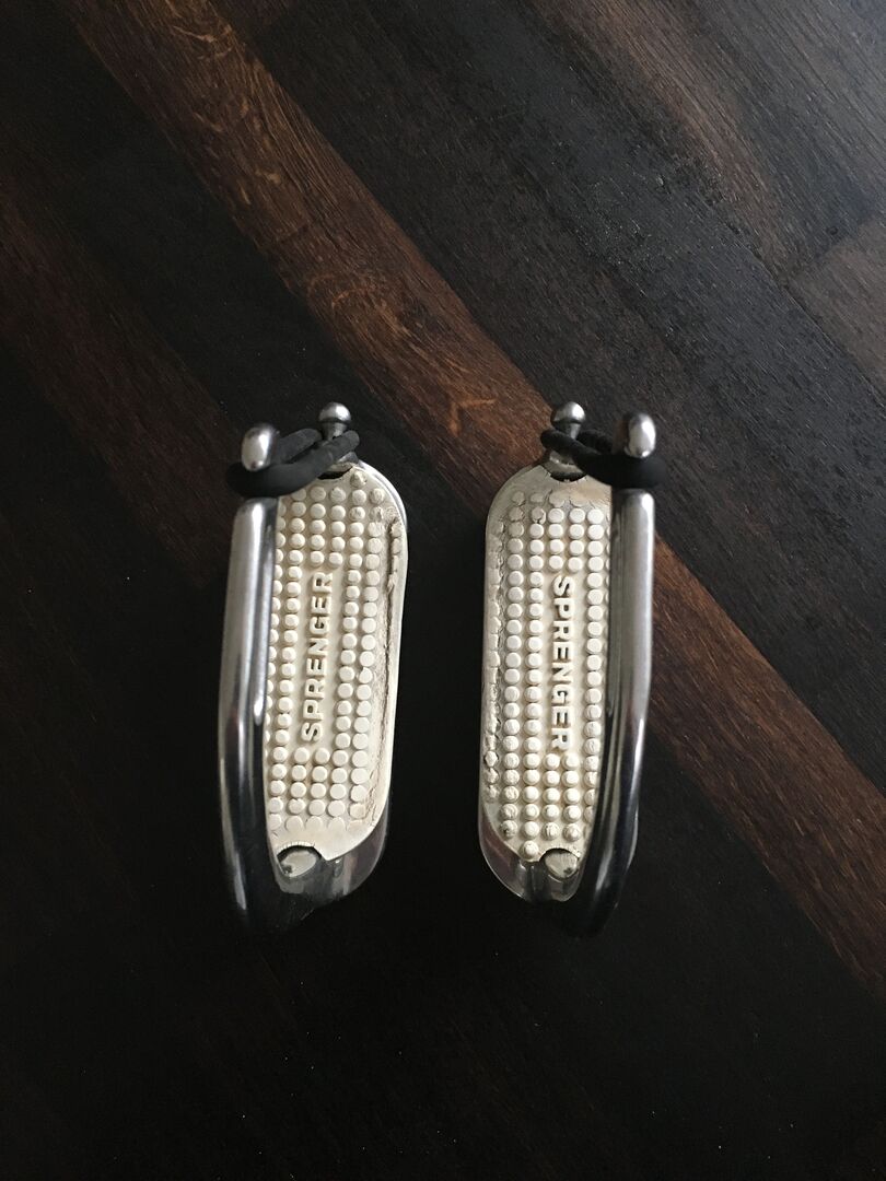 Sprenger stigbyglar med sidogummi 11cm - Jag säljer mina Sprenger-byglar som är i gott skick. Trädet är 11 cm, tyvärr är det lite slitet men kan bytas ut liksom gummorna. (Båda fungerar fortfarande fullt ut se bilder). Kontakta mig gärna om du har några frågor eller är intresserad!