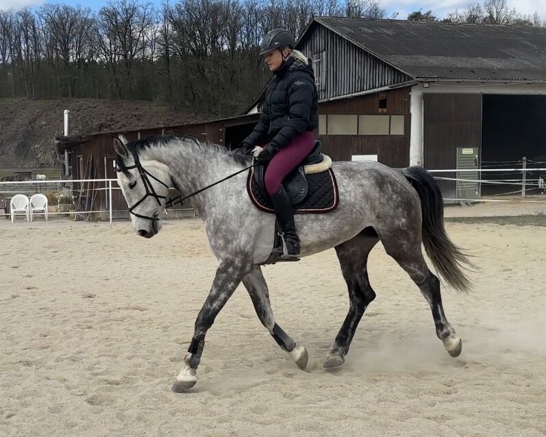 Springstjärt med bästa karaktär och bästa sammansättning - 6-årig Spring Stute von Cassinis Son x Renomee Z, ca 174 cm stor, i A** Springen platziert. Die Stute är mycket modig, skräckinjagande och även lämplig för juniorer. In der Freisringen springt sie 150 cm och förbättrar sig under dem Sattel ständig. Sedan tidigare har den varit 100 cm lång på vändskivan, men det är inget problem att gå högre. Den har potential för den höga sporten. Dessutom är hon mycket modig och kan även bära små barn.