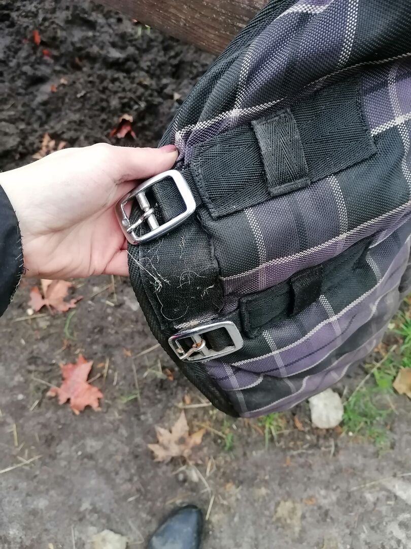 Stabilt skydd 145 - Vacker stallmatta till salu i storlek 145, som har legat på hästen en vinter. Spännen och magband är i ordning. Den har 200 g fyllning