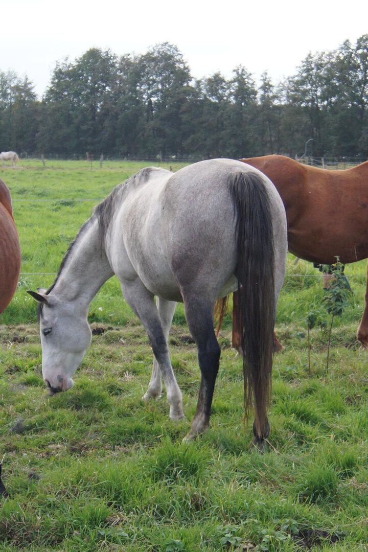 NW Beautiful Jazzgun - vackert, grått Paint Horse-sto med en stark grund och korrekta, raka ben. Hon övertygar med sin fantastiska färg och en uttrycksfull, harmonisk exteriör - ett riktigt blickfång! Stoet kommer från en beprövad, bra reining / klippning stamtavla och är NRHA registrerad. Hon har ännu inte blivit inriden på grund av tidsbrist och är därför oanvänd. På grund av ett chip på höger fram, som upptäcktes av en slump under en AKU, säljs hon som ett ridbart avelssto - hon visar ingen hälta eller begränsningar. Jazz är född 2019 och är 150 cm lång. Hon har en härlig karaktär, är människovänlig, gosig och alltid hanterbar. Mycket väluppfostrad. Jazz bor i ett öppet stall och är lämplig för vallning. Hon är 5-panel n/n. Kan markarbete och longering. Jazz har en bra, gammal reining / klippning stamtavla. Hennes far, JBars Cromed Gun, är son till Superior Open-Honor Roll Champion Gunners Crome Gun. Hennes mor är en beprövad avelshingst efter Mister Dual Spring - IRCHA Open Cowhorse Futurity Champion, flera gånger Open Bronze Trophy Champion eller Reserve Bronze Trophy Champion, producent av flera gånger NRHA of Germany Open Breeders Futurity Finalists och NRHA of France Open Derby Champion.