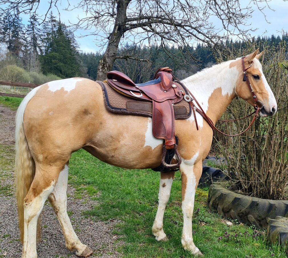 starkt, vackert Paint Horse-sto för långa ridturer etc. - På grund av tidsbrist söker detta vackra, uttrycksfulla Paint Horse-sto ett nytt hem. Hon är född 2018 och har en längd på 155 cm. Magic är ett storramigt sto med en kompakt och mycket stark kroppsbyggnad. Ett riktigt blickfång i den fantastiska färgen palomino-tobiano. Hon kan box- och öppen stallhållning och är 6-panig n/n om sina föräldrar. Magic har en gedigen westernutbildning och har varit i professionell ridning i 2 månader. Stoet rids mycket på landet och har just deltagit i en orienteringsridning. Hon är mycket välskött och orädd i terrängen. Hon känner också till olika ryttare. Magic skulle vara idealisk för en trailryttare. Hon behöver daglig motion och bör ridas regelbundet. Hon skulle vara idealisk för någon som vill/kan tillbringa tid med sin häst på daglig basis och som tycker om att rida terränglöpning, eller som vill delta i en liten tävling då och då. På grund av en läkt skada säljs hon under värde till goda händer.