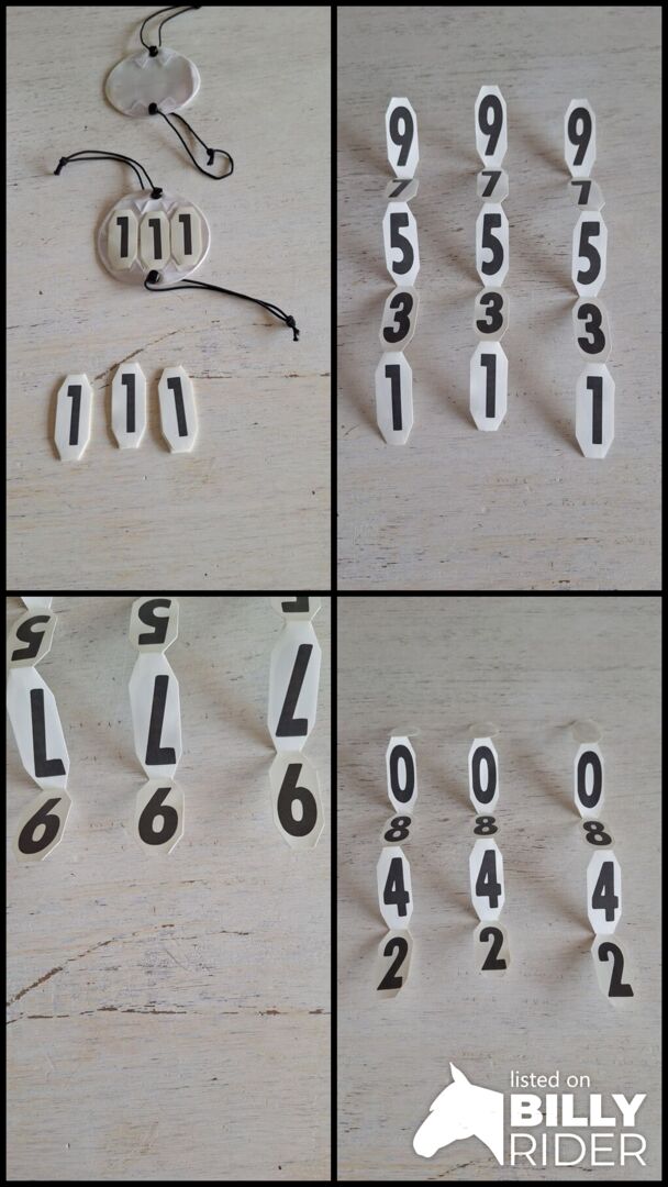 Startnummer för turneringen - Par om 3 st 0-9 siffror 1 till 999 tillverkade av plast diameter 8cm svart skrift på vit bakgrund fixeringsgummi