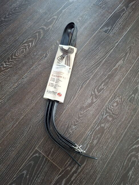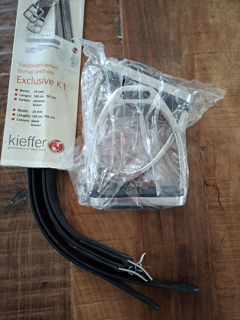 Stigbygelskinn 155 cm och stigbyglar i rostfritt stål 12 cm med stigbygelinlägg - Kieffer stigläder 155cm, 25mm breda
