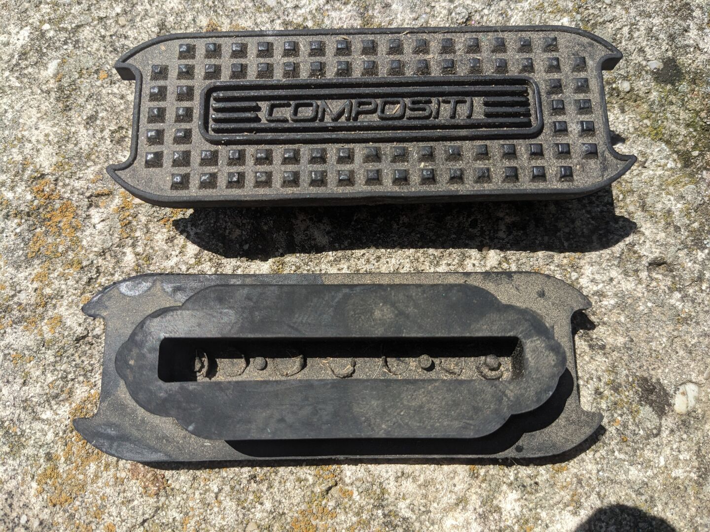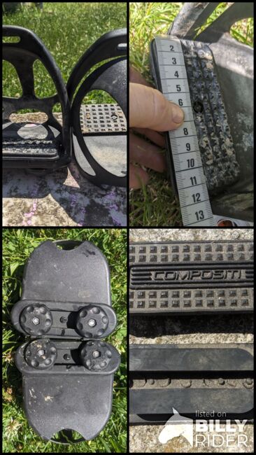 Stigbyglar av kompositplast med halkskydd - Lättviktsbyglar i svart plast av märket Compositi 12 cm, insats med halkskydd för närvarande monterad (monteras enkelt med vridlås på undersidan, se bild), matchande bygelinsatser utan halkskydd ingår (se bild).