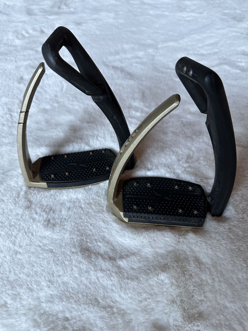 Stigbyglar för frihopp Soft'Up Pro + Limited Edition Gold - Hej, jag säljer mina Freejump Soft'Up Pro + Premium stigbyglar i färgen guld med ett tungt hjärta. Stigbyglarna är i mycket gott skick och har bara några repor på undersidan, som naturligtvis inte syns på sadeln.