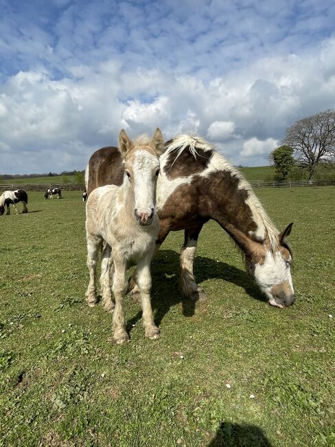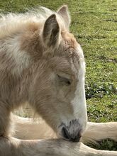 Stoet Irish Cob - Vackert märkt sto i färgen Palomino Tobiano letar efter en 5⭐️🏡 efter avvänjning. Mayleen kommer att nå en sluthöjd på över 150 cm. Vid 3 veckor är hon nu 112/115 cm. Hon kommer att få ett pass från ICS Nederland. Båda föräldrarna är registrerade hos ICS Nederland. Hon växer upp i en blandad besättning i ett öppet stall med bete året runt. Hon lyssnar på sitt namn och kan bli rörd överallt. Foal ABC praktiseras.