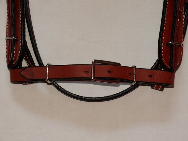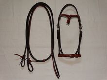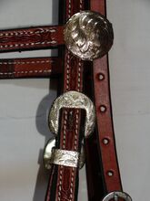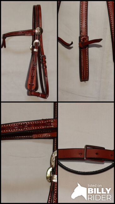 Stonedeek COB Western Huvudstall Lätt byte inkl. tyglar/delade tyglar Premium Latigo NP över 100 - Nytt Stonedeek western träns/western huvudlag 'Easy Change' till salu. Inkl. tyglar/split reins premium och hakrem. Huvudstallet är stämplat och har silverbeslag.