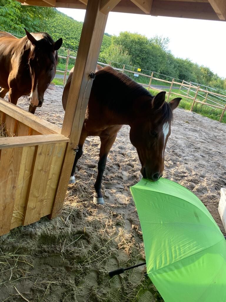 Hon är också avslappnad under skrämselträning. Hon är mycket vänlig mot andra hästar.