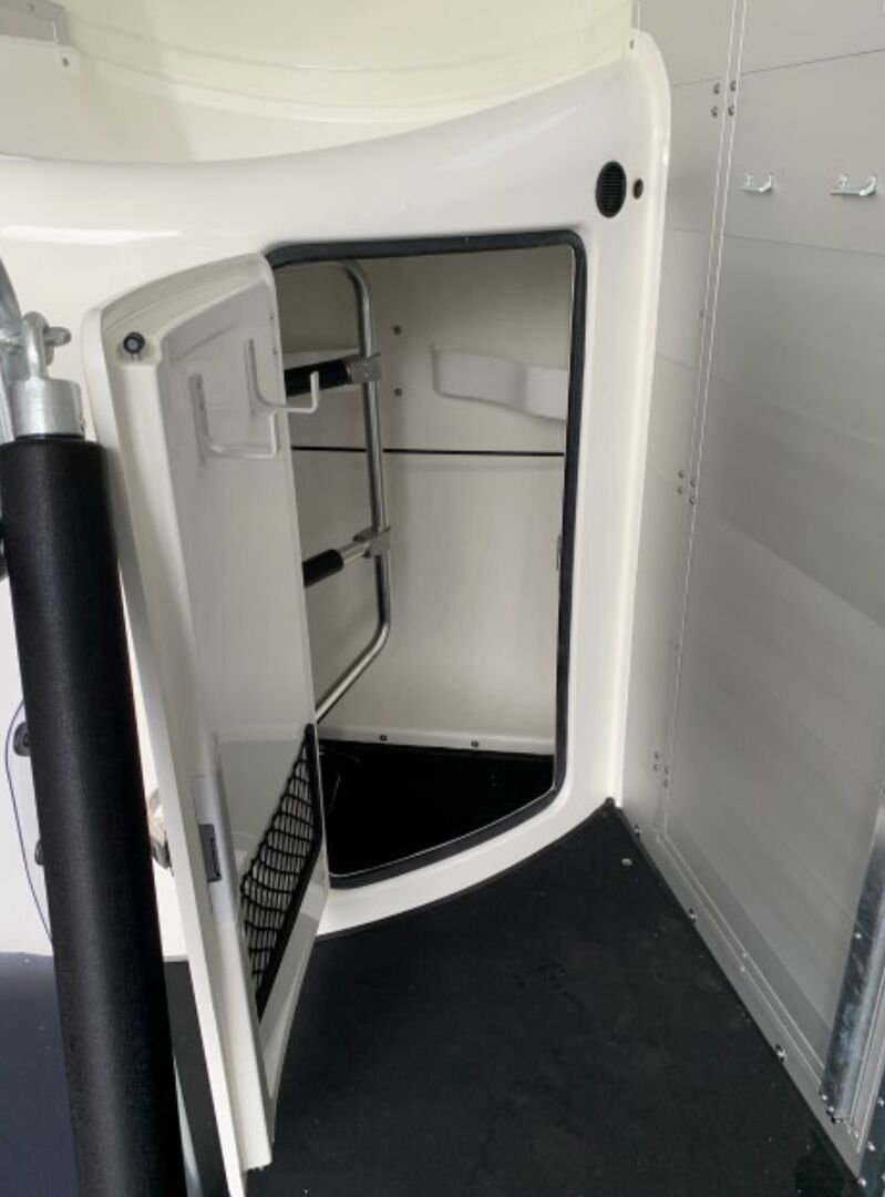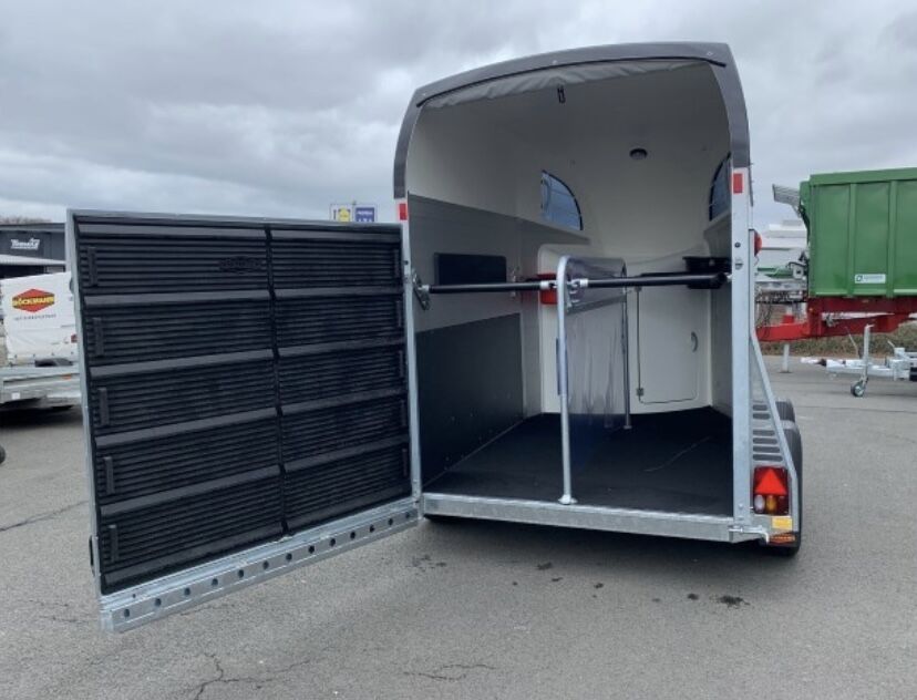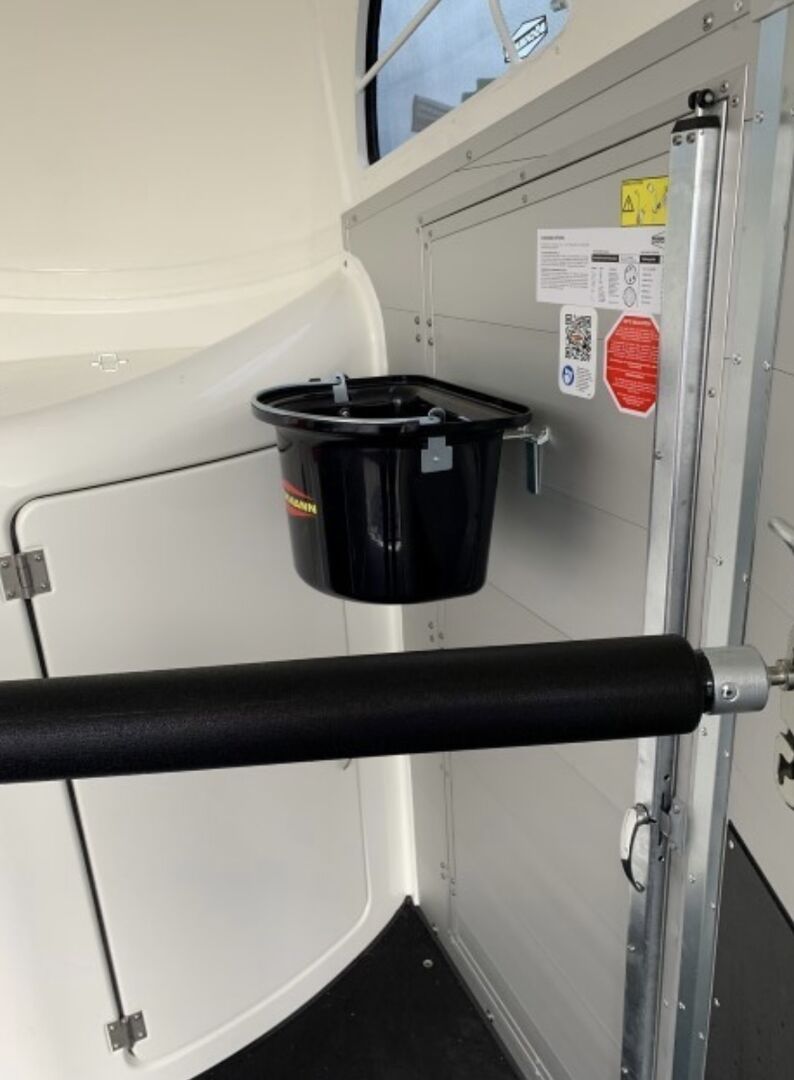Stängt bakre stag, registreringsskylthållare med 2 steg, manöverhandtag Multi Safe System (säkerhetslåda med stångsystem) (justerbar i höjd och längd), gummigolv limmat och tätat Gummi på lastlucka (integrerade steglister) och sidostopp LED-taklampa i hästutrymmet (blå/vit), sidostycken (2 st) PVC-genomskinlig skiljevägg med PVC-överdel (hästar med boxar 165 cm) Sidostegsskydd, plast (svart), extra klädsel för boxstänger Sadelbox i fronten av polyester med 2 innerdörrar 2 svängbara och utdragbara sadelhållare, 1 skördehållare, 4 tränsbygelkrokar 2 dörrnät, LED-innerbelysning i sadelboxen, plastspade med handtag Kvast med teleskopskaft, 2 fodertråg, dekorlist med hästhuvud (konstnärsdesign) Belysningssystem med backljus och 13-polig kontakt Kabel och hållare för videoövervakning Inkl. typcertifikat