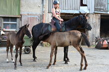 Stor PRE svart sto mycket väluppfostrad - Macarena de Lucia är ett 5,5 år gammalt PRE svart sto med ren Escarlata stamtavla. Hennes hingstindex är 98,31% och hon är ett renrasigt sto av färgen svart EEaa. För närvarande är Macarena 159 cm lång, hon kan mycket väl växa ytterligare 1 eller 2 cm. Hon är mycket nervös, gosig och vänlig. Macarena har ridits, på ridbanan och i fält, och hon är väluppfostrad med en trevlig framåtdrivning. Hittills har hon fått 2 ston, varav det ena fortfarande är fölande fram till september. Escalera-linjen är en av de äldsta blodslinjerna i Spanien och är resultatet av ett konsekvent avelsprogram för en familj som går tillbaka mer än 200 år. Escalera-hästarna kännetecknas av en hög prestationsvilja, barocka, ädla hästar med fysisk styrka, god ridbarhet och enastående rörelser. Grunden till Escalera-hästarna var huvudsakligen bruna ston, med några få undantag av svarta hästar, som sedan avlades till de bästa och mest kraftfulla hingstarna i Yeguada-militären. Av denna anledning är Escalera-hästar särskilt lämpliga för dressyr och ligger alltid i topp på alla avelsutställningar. Macarena är vaccinerad, regelbundet avmaskad och vid utmärkt hälsa. Hon är bekant med lantbruksmaskiner och andra lantbruksdjur samt med lekande barn och tycker också om att smida och lasta. Hon kontrollerades av en osteo efter födseln.
