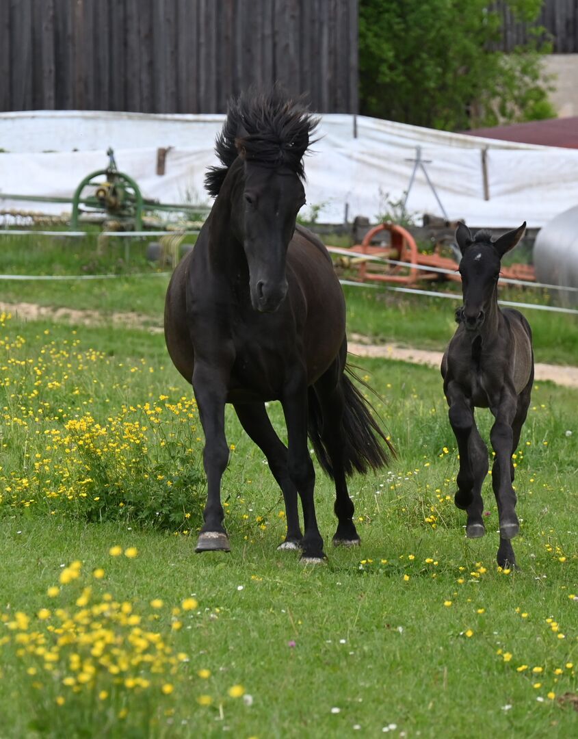 Stor PRE svart sto mycket väluppfostrad - Macarena de Lucia är ett 6-årigt PRE-svart sto med ren Escarlata-stamtavla. Hon föddes i Spanien och gick först till Frankrike som föl innan hon kom till mig därifrån. Hennes hingstindex är 98,31% och hon är ett renrasigt sto av färgen svart EEaa. För närvarande är Macarena 159 cm lång, hon kan mycket väl växa ytterligare 1 eller 2 cm. Hon är mycket nervös, gosig och vänlig. Macarena har ridits, på ridbanan och i hagen, och är väluppfostrad med en trevlig vilja att gå framåt. Hittills har hon fått 2 svarta fölungar. Födslarna var bra och oproblematiska. Escalera-linjen är en av de äldsta blodslinjerna i Spanien och är resultatet av ett konsekvent avelsprogram i en familj som går tillbaka mer än 200 år. Escalera-hästarna kännetecknas av en hög prestationsvilja, barocka, ädla hästar med fysisk styrka, god ridbarhet och enastående rörelser. Grunden till Escalera-hästarna var huvudsakligen bruna ston, med några få undantag av svarta hästar, som sedan avlades till de bästa och mest kraftfulla hingstarna i Yeguada-militären. Av denna anledning är Escalera-hästar särskilt lämpliga för dressyr och ligger alltid i topp på alla avelsutställningar. Macarena är vaccinerad, regelbundet avmaskad och vid utmärkt hälsa. Hon är bekant med lantbruksmaskiner och andra lantbruksdjur samt med lekande barn och tycker också om att smida och lasta. Hon kontrollerades av en osteo efter födseln.