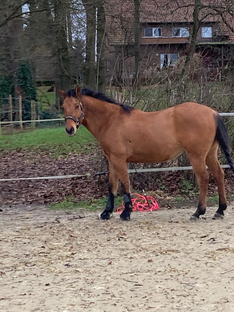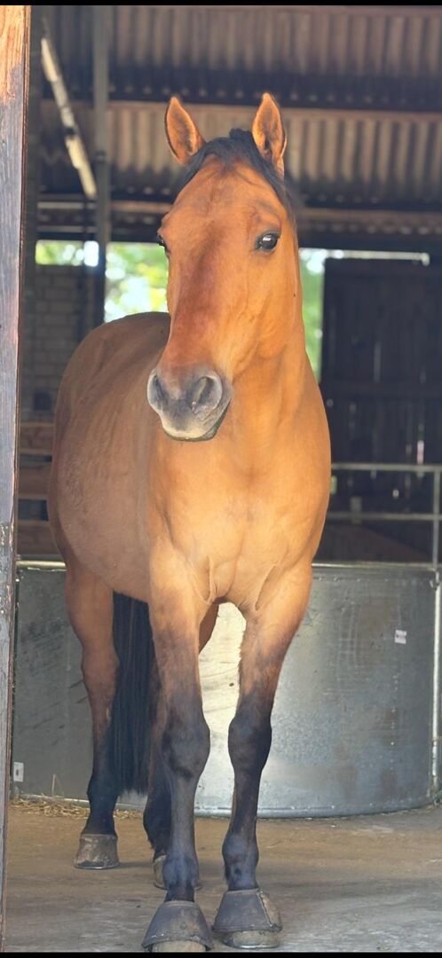 Stor QH-valack med westernutbildning söker en erfaren ryttare - Ort: 45721 Haltern am See Taris Stepjac Dr No - en Quarter Horse valack född 2012 med en höjd på ca 150 cm. Han har den slående färgen dun och imponerar med sin kompakta, starka byggnad och en särskilt människoorienterad, känslig karaktär. Tari har ingen stamtavla, men kommer med ett pass och är genetiskt 5-panel n/n testad. Han är westernriden, men för närvarande inte i träning. Vi gör för närvarande mycket markarbete med honom, och han är ivrig att lära sig och uppmärksam. Han känner sig bekväm i fältet, där han går säkert och ensam. Tari är alltid väluppfostrad, känner till öppen uppstallning i en blandad besättning och kan också klara av att hållas i ett bås - även om öppen uppstallning föredras. Han är väluppfostrad hos veterinären och hovslagaren, regelbundet avmaskad, vaccinerad och har en årlig tandkontroll. Tari har en spavin baktill - röntgenbilder finns tillgängliga. Han behöver därför en lämplig spavinsko. Han är också en popper, men klarar sig bra med detta. Det är viktigt att veta att han inte är en nybörjar- eller barnhäst. Tari behöver en erfaren ryttare som arbetar varsamt med honom, utmanar och uppmuntrar honom. Han kan ibland bocka i vissa situationer. Tari kommer endast att lämnas vidare till kärleksfulla och kompetenta, erfarna händer - därför gäller utrymme före pris för honom. Ett bra hem har absolut prioritet.