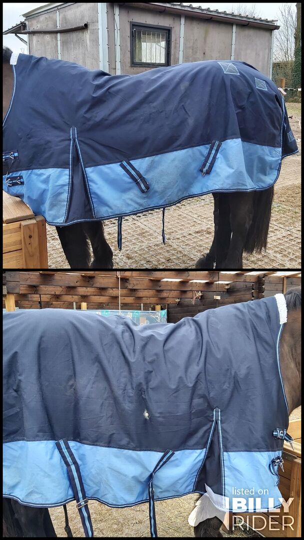 Storlek 135 100gr. utomhusmatta paddockmatta - Filten är prfoi lappad på flera ställen, den är tätt Nyligen tvättade och impregnerade. Låg på den igen bara för fotots skull
