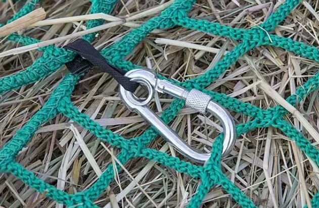 Stort hönät för 10 kg hö, lätt att fylla - Det här extra stora hönätet kan enkelt fyllas uppifrån och stängas med hjälp av fyra säkerhetskrokar. Krokarna är speciellt utformade för att minimera risken för skador på hästarna när de äter från nätet. Perfekt för utfodring av flera hästar i öppna boxar eller i paddocken. Maskvidd 4 x 4 cm. 150 x 60 cm. Kapacitet 10 kg. Med säkerhetskarbin. Användes bara en kort tid eftersom den inte längre behövdes efter att stallet byttes ut.