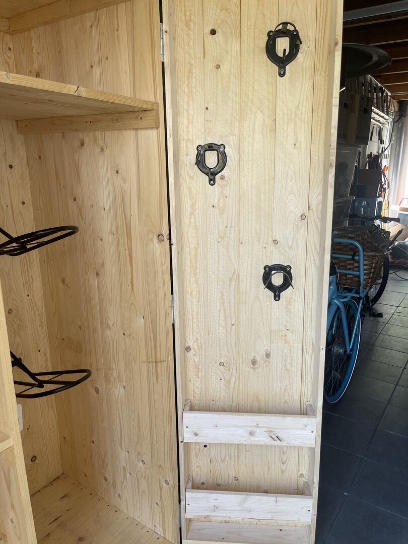 Skåpet är perfekt för en western-sadel och många tillbehör. Skåpet mäter 1,0 m x 2,0 m x 0,80 m (BxHxT). Den ena dörren har två fack och tre hållare för tyglar. Den andra dörren har en skördehållare.