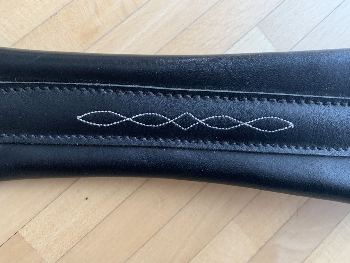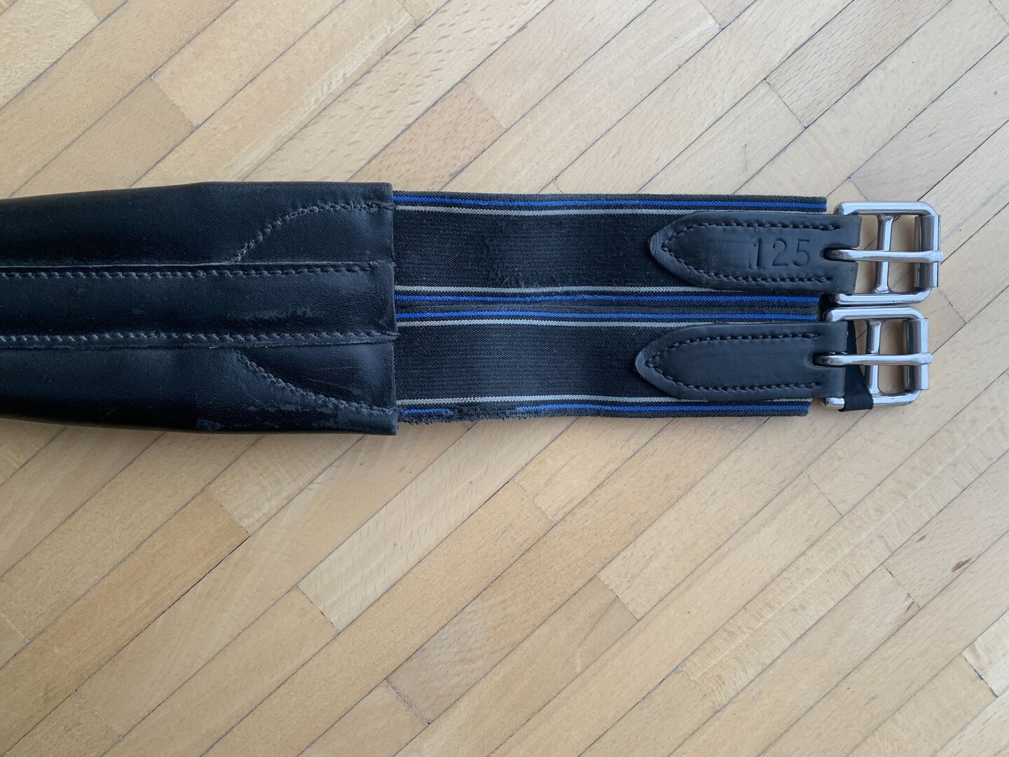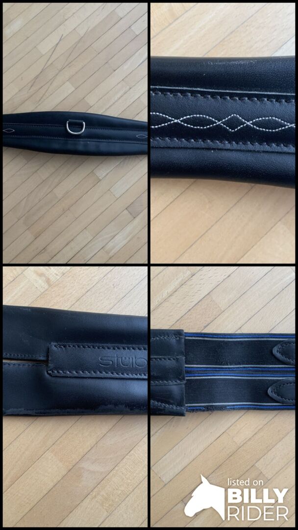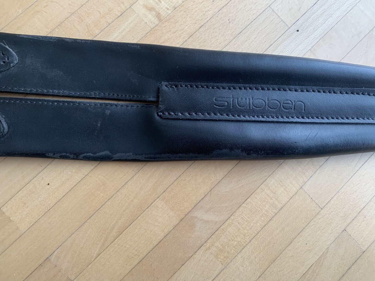 Stübben Saddle Girth - Jag erbjuder en Stübben-sadelgjord i läder med elastik på ena sidan i 125 cm. Lädret är svart och bältet är broderat i vitt. Det finns lätta användningsspår på båda sidor i axelhöjd.
