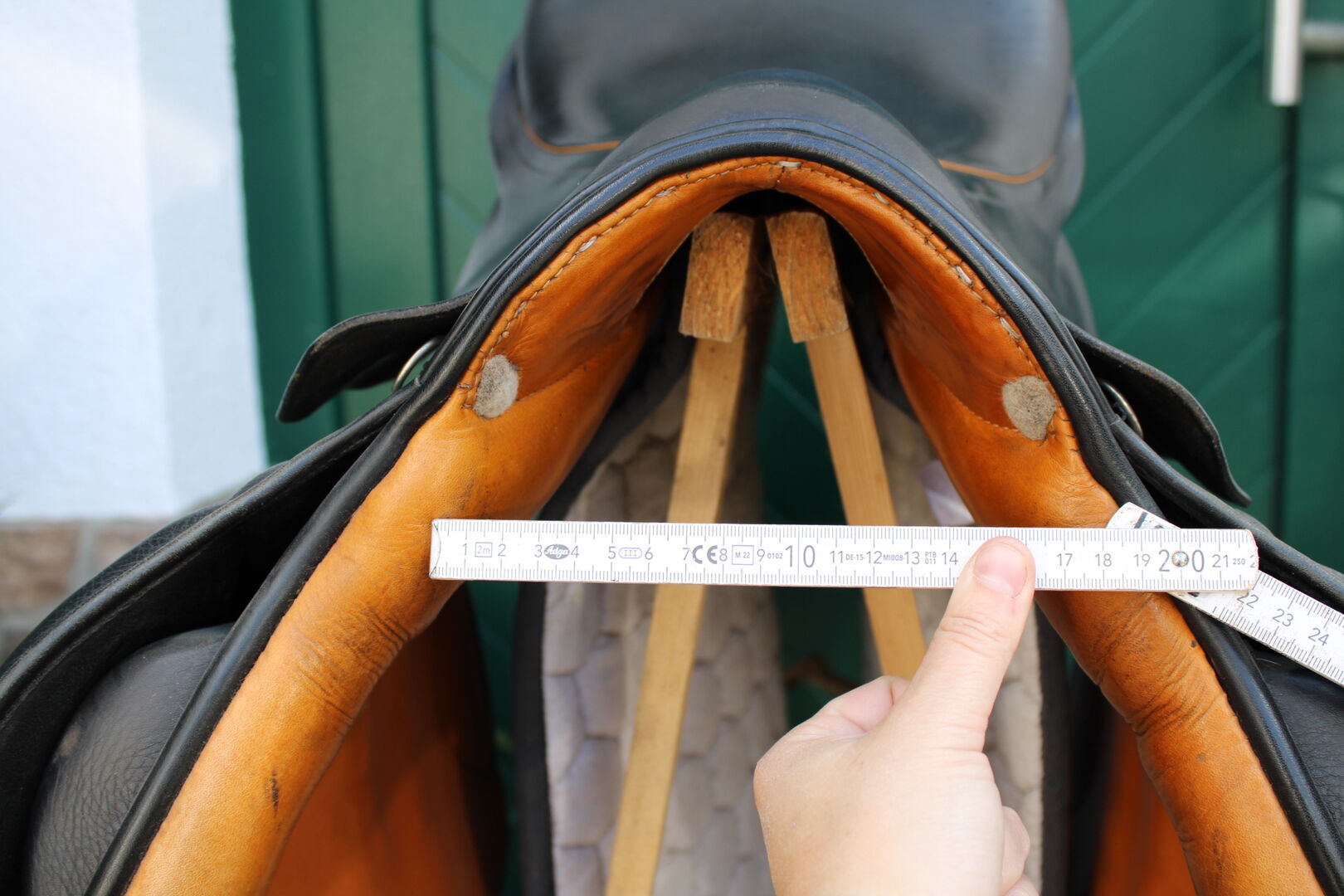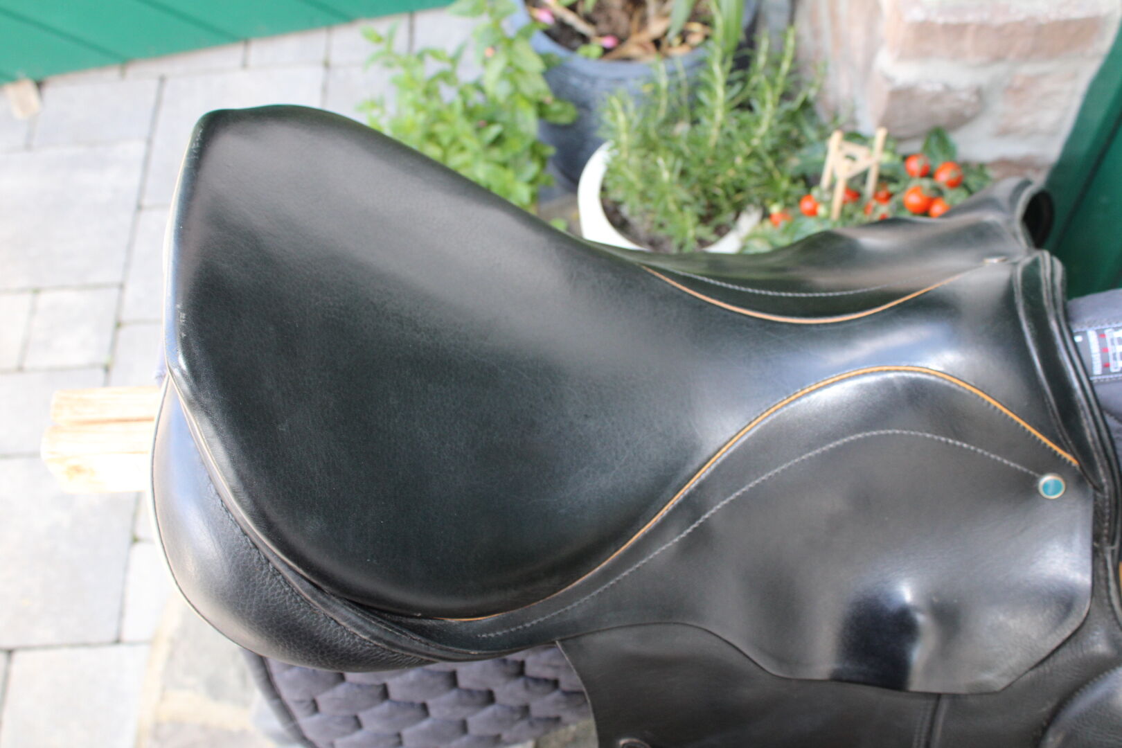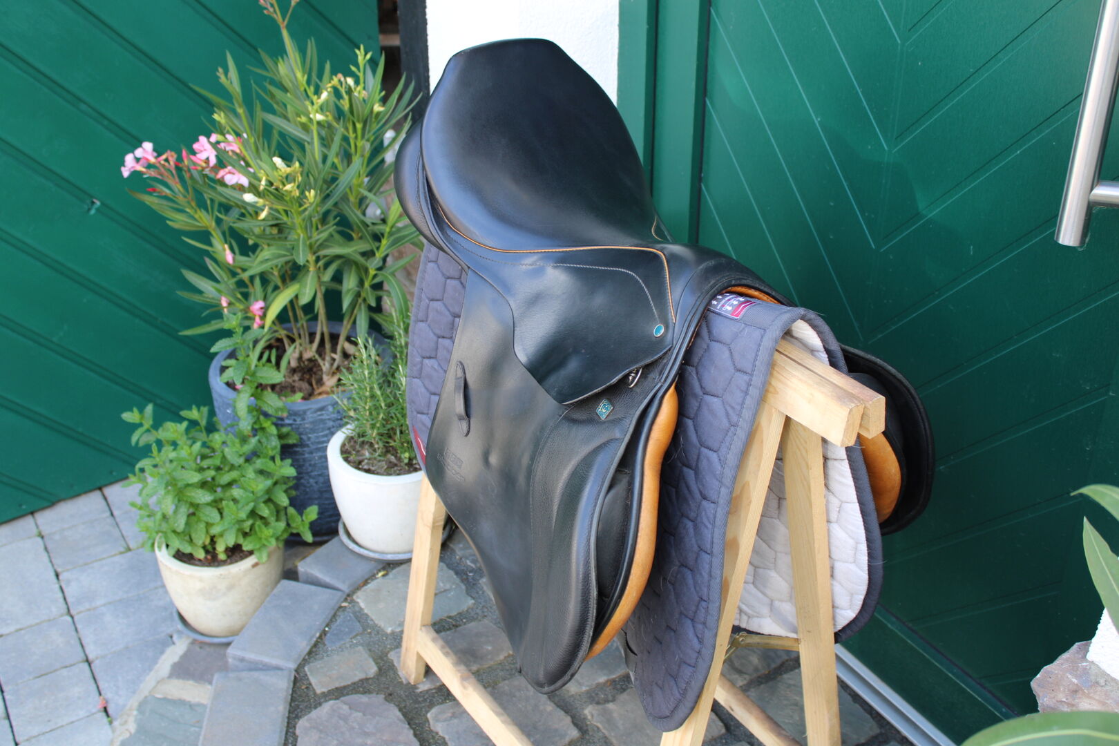 Som framgår av bilderna är sadeln i perfekt skick. Sadeln användes endast i 1,5 år (hästen dog tyvärr oväntat) och förvarades sedan torrt i det uppvärmda sadelrummet med sadelöverdrag. Då vi tyvärr har tillräckligt med hoppsadlar flyttar nu denna ut.