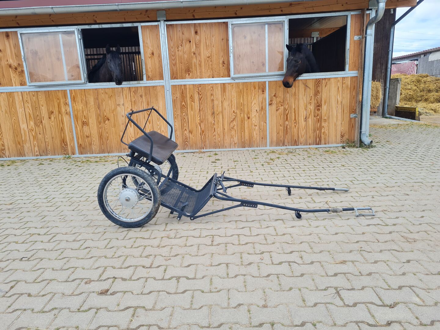 Sulky/Gig för ponny - Jag säljer spelningen, som jag själv köpte begagnad och därför kan jag inte säga något om dess ålder. Bromsen fungerar, ryggstödet håller på att stoppas om, så det syns inte på bilderna. Jag har satt tejp på varje sida av gaffeln för att skydda den eftersom det finns skruvhuvuden under den och min ponny gillade att skava sig. Så ingen skada har skett. Däcken är också lika bra som nya. Det finns dock tecken på användning och en eller två skruvar har börjat rosta.